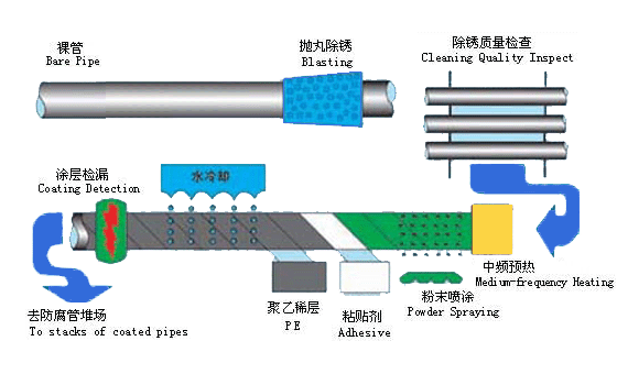 管道三層PE防腐結(jié)構(gòu):**層環(huán)氧粉末(FBE>100um),第二層膠粘劑(AD)170~250um,第三層聚乙烯(PE)2.5~3.7mm。三種材料融為一體,并與鋼管牢固結(jié)合形成優(yōu)良的防腐層。